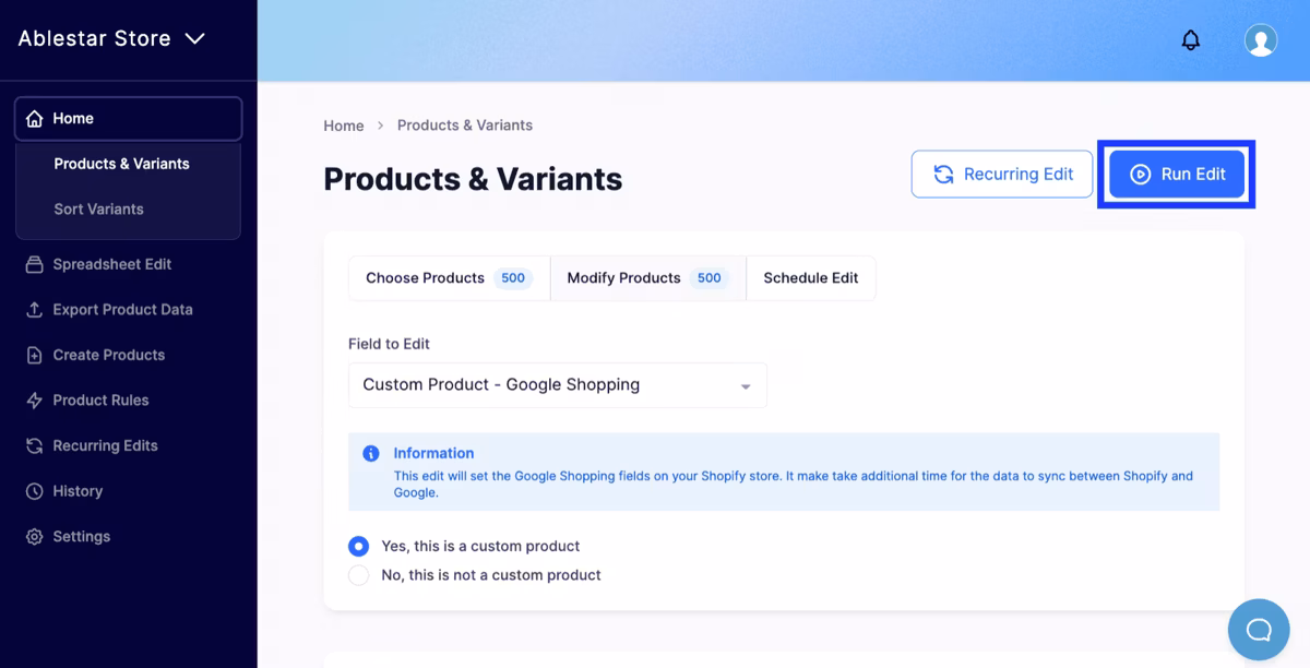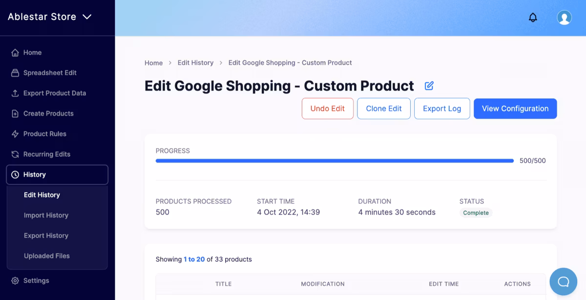 Using an app outside of the Google Sales Channel app can give you added visibility into your syncing issues. For instance, with the Ablestar Bulk Product Editor, you can see exactly when your data was sent to Shopify and Google and have more control with edit previews and reversals.