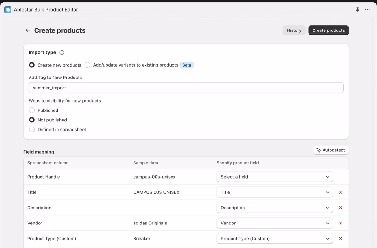 - Follow the prompts to map the spreadsheet columns to Shopify fields. Use ‘Autodetect’ and manually map any that don’t match up.