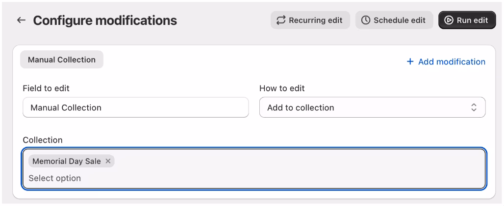 In the app available in the Shopify Admin, search for products you wish to add to a manual collection. You can search by name, brand, price, or any number of fields. Next, select ‘Manual collection’ as the field to edit and ‘Add to collection’ or ‘Remove from collection’ for how to edit.