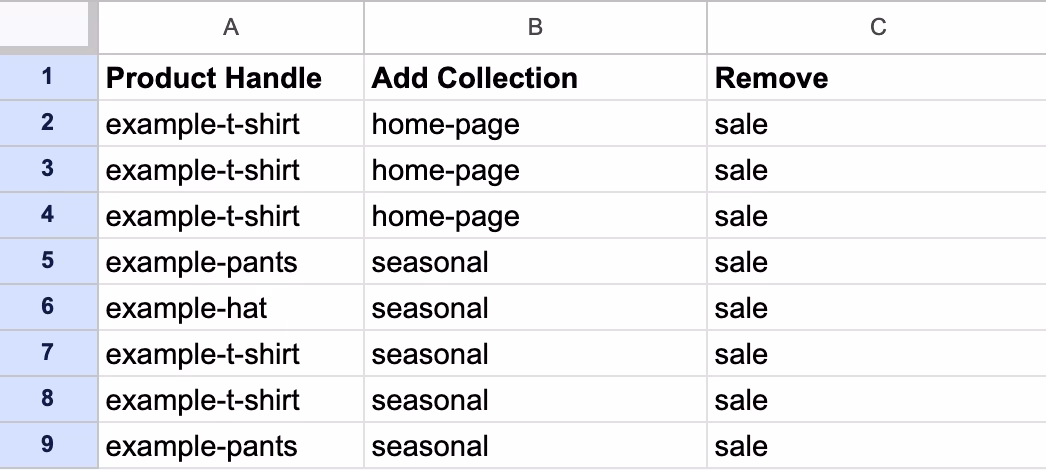 With Ablestar Bulk Product Editor, you can also edit products in manual collections with a spreadsheet. Simply upload a spreadsheet with the product handle and columns for ‘Add collection’ or ‘Remove’ with collections listed under each. Confirm the instructions in the upload process, run the edit, and your collections will be quickly updated.