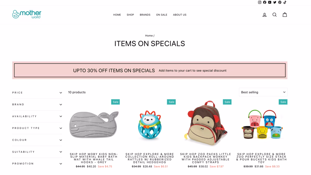 One of the best ways to drive customers to your sale stock is to add a “Sale” or “Clearance” section on your website. This can be a permanent fixture on your navigation menu or can feature rotating seasonal sales such as “Fall Sale”.